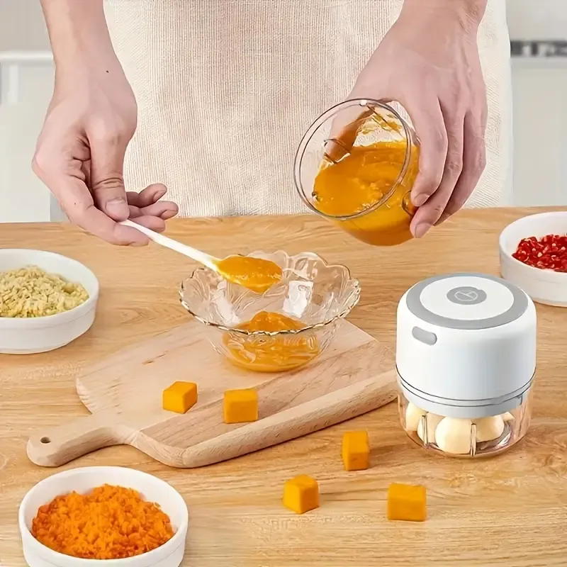 Why do you need a manual food processor? Because it can save you much precious time and labor. Electric garlic press is equipped with a 40-watt powerful motor and 3 hard and sharp blades, which can easily chop garlic, onion, chili, parsley, shallot, ginger, peanut, and other common ingredients within 10s, thereby saving you a lot of time. The capacity of the electric food chopper is 250ml, just right to meet the demand of a small amount, without food waste.