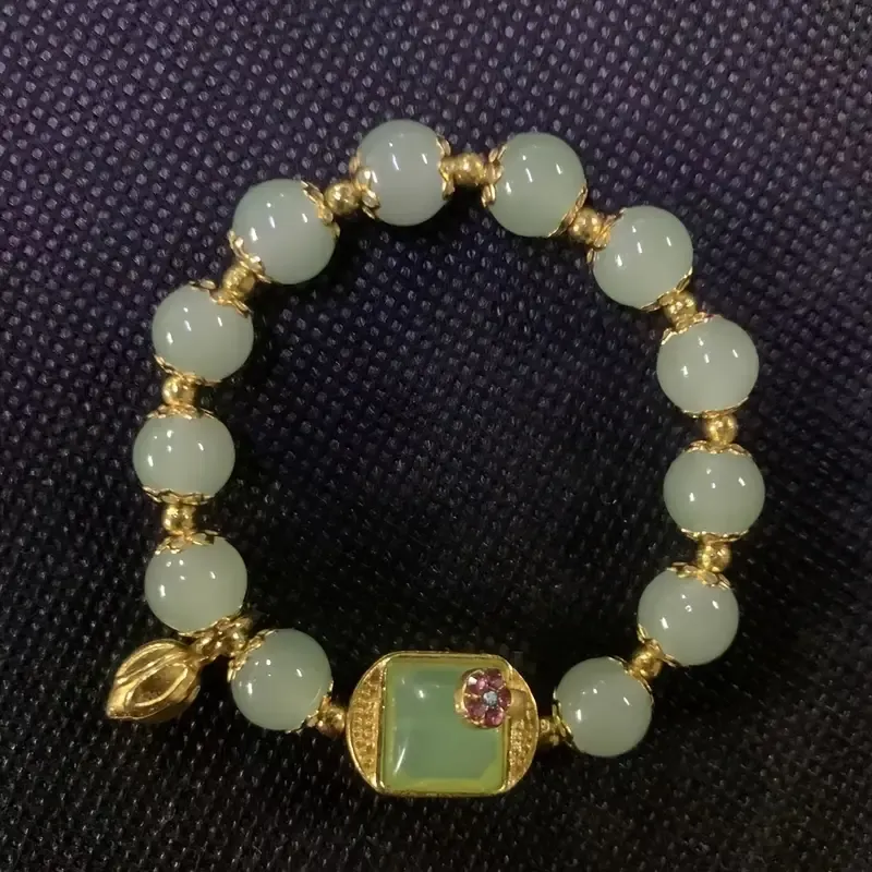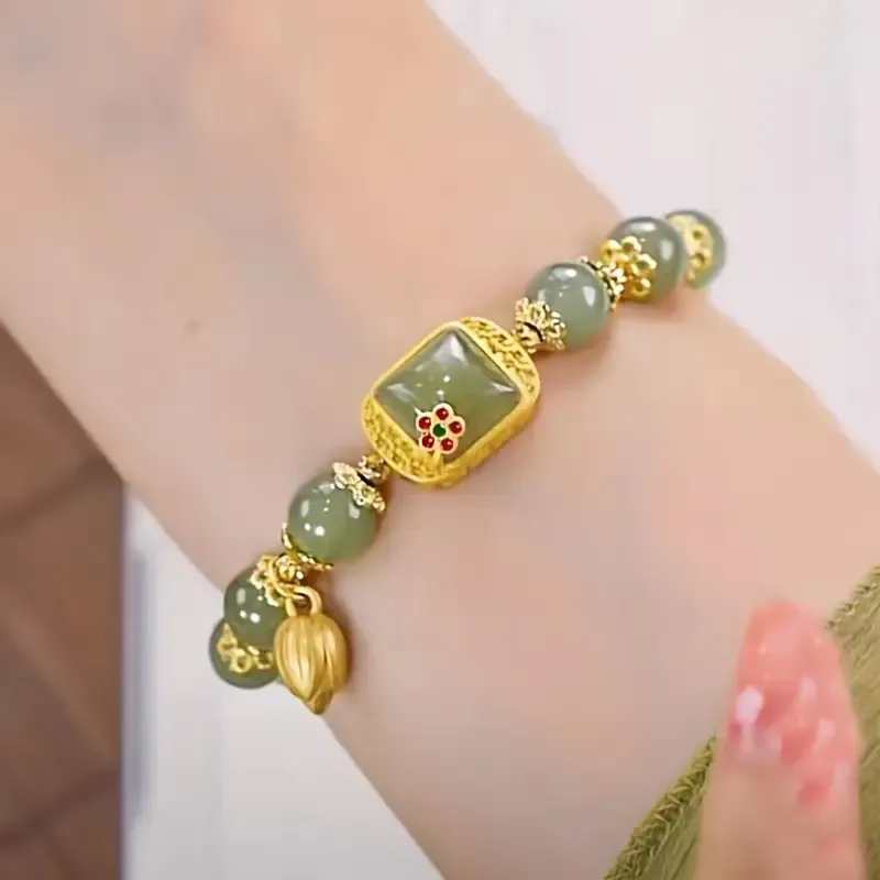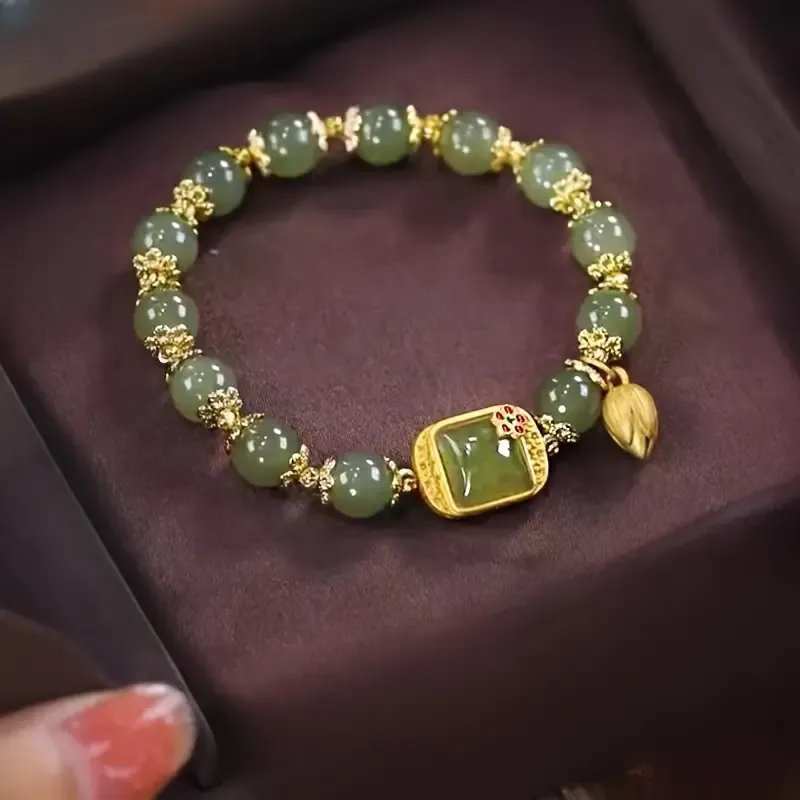 ✨Natural Jade & Gold Bracelet | Hollow Floral Pendant & Golden Leaves Elegant & Versatile for Daily & Gala