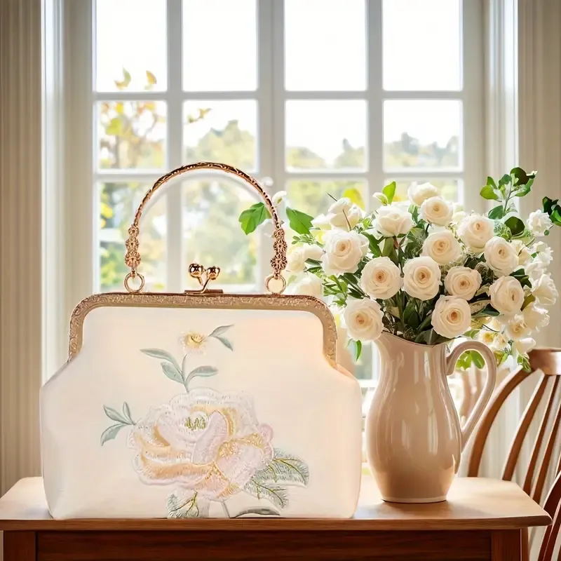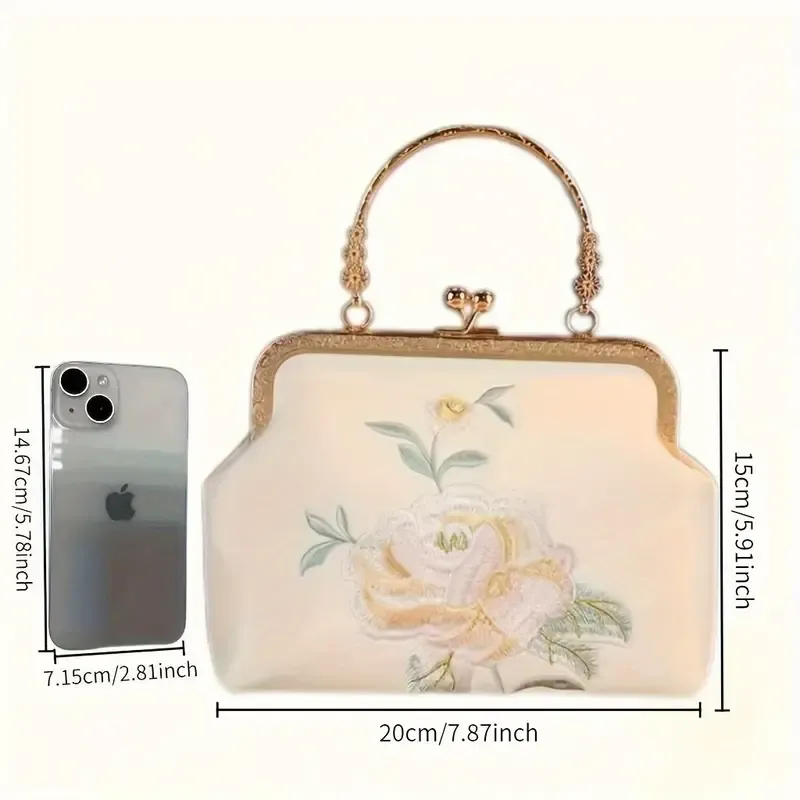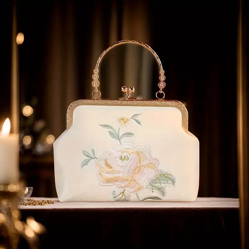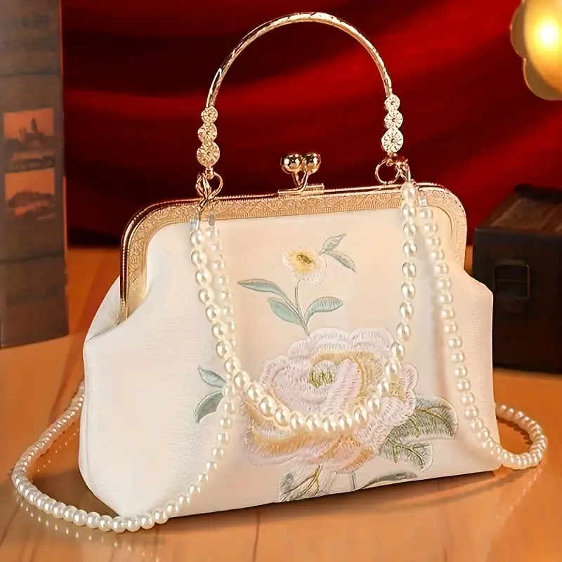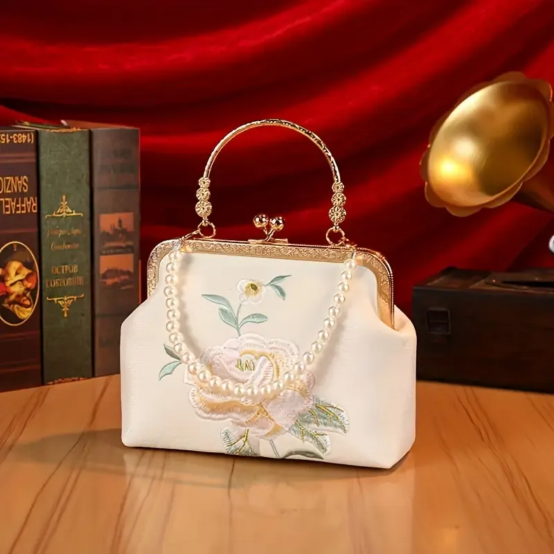 Elegant Heritage Embroidered Pearl Chain Bag | Gilded Lock in Oriental Style