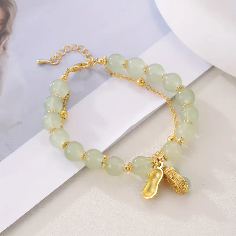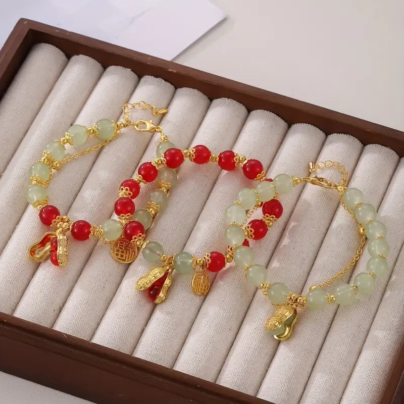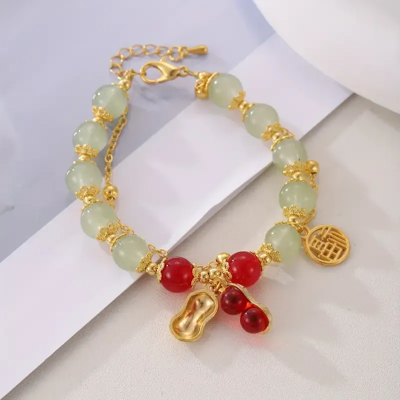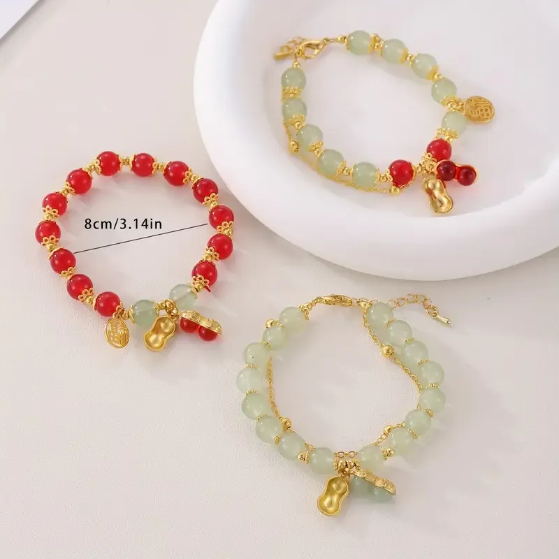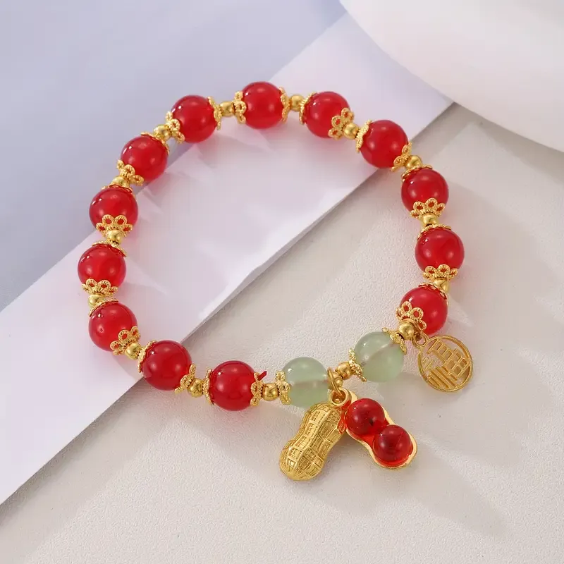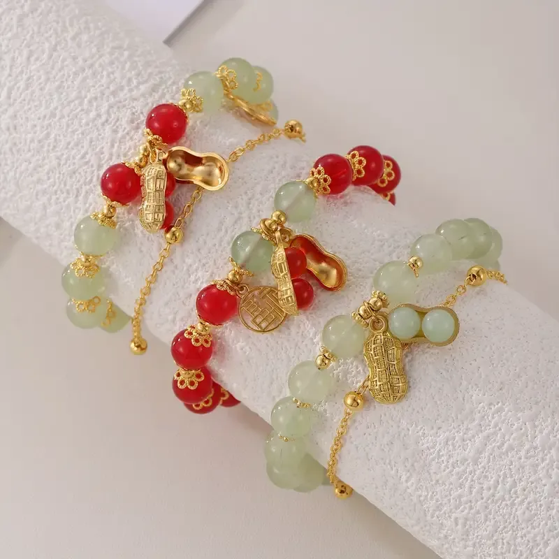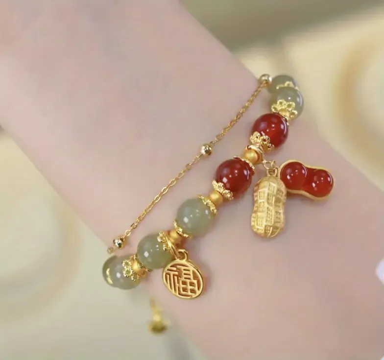 Good Fortune Peanut Natural Agate Bangle Red & Green with Golden Accents Elegant Design Auspicious Blessings Daily Luck