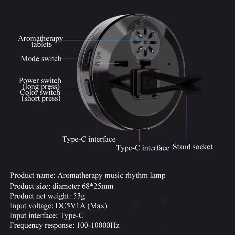 [Product Name]: RBG round aromatherapy music rhythm lamp[Material]: PC+ABS